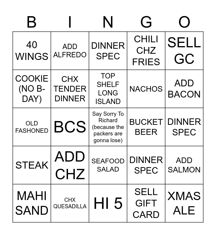 This bingo card has a free space and 24 words: ADD CHZ, CHX QUESADILLA, TOP SHELF LONG ISLAND, MAHI SAND, SELL GC, 40 WINGS, COOKIE (NO B-DAY), ADD ALFREDO, BUCKET BEER, SEAFOOD SALAD, NACHOS, OLD FASHONED, DINNER SPEC, ADD SALMON, CHX TENDER DINNER, SELL GIFT CARD, DINNER SPEC, DINNER SPEC, ADD BACON, BCS, XMAS ALE, STEAK, CHILI CHZ FRIES and HI 5.