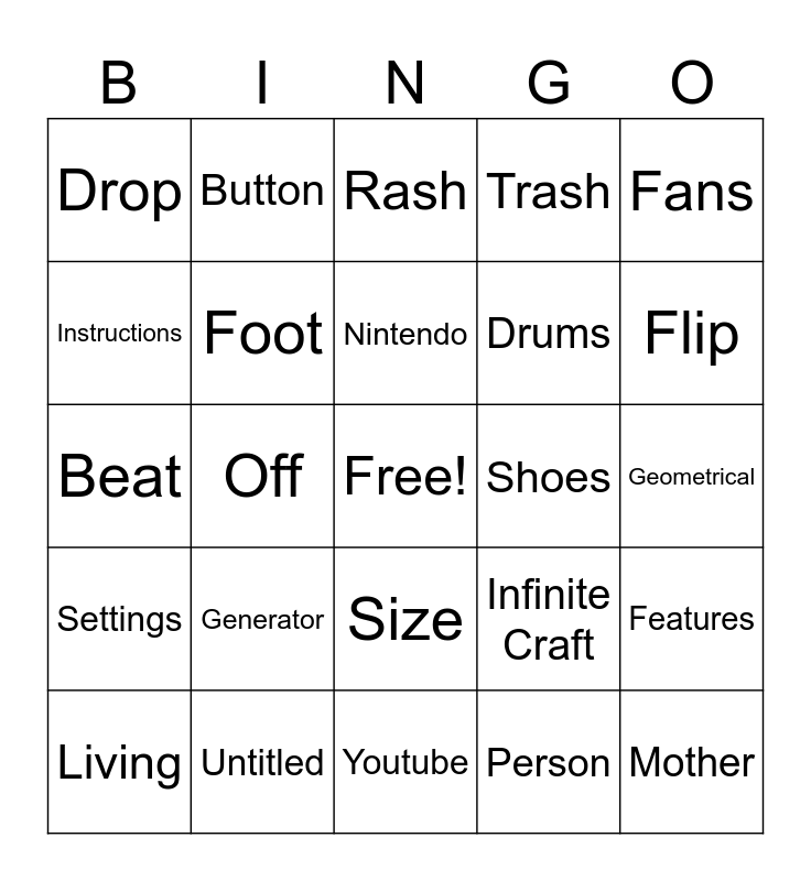 This bingo card has a free space and 24 words: Generator, Untitled, Nintendo, Living, Fans, Drop, Instructions, Button, Shoes, Size, Drums, Beat, Infinite Craft, Features, Foot, Person, Geometrical, Rash, Flip, Off, Mother, Settings, Trash and Youtube.