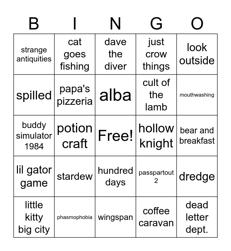 This bingo card has a free space and 24 words: stardew, phasmophobia, alba, little kitty big city, look outside, strange antiquities, spilled, cat goes fishing, hollow knight, hundred days, cult of the lamb, buddy simulator 1984, passpartout 2, dredge, papa's pizzeria, coffee caravan, bear and breakfast, dave the diver, mouthwashing, potion craft, dead letter dept., lil gator game, just crow things and wingspan.
