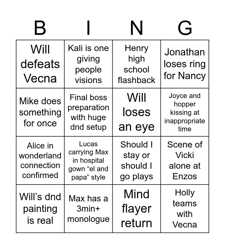 This bingo card has 16 words: Max has a 3min+ monologue, Scene of Vicki alone at Enzos, Henry high school flashback, Will defeats Vecna, Alice in wonderland connection confirmed, Kali is one giving people visions, Should I stay or should I go plays, Mind flayer return, Mike does something for once, Final boss preparation with huge dnd setup, Will’s dnd painting is real, Jonathan loses ring for Nancy, Lucas carrying Max in hospital gown “el and papa” style, Joyce and hopper kissing at inappropriate time, Will loses an eye and Holly teams with Vecna.
