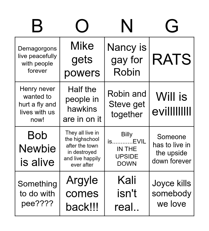 This bingo card has 16 words: Argyle comes back!!!, Someone has to live in the upside down forever, Nancy is gay for Robin, Demagorgons live peacefully with people forever, Bob Newbie is alive, Mike gets powers, Billy is............EVIL IN THE UPSIDE DOWN, Kali isn't real.., Henry never wanted to hurt a fly and lives with us now!, Half the people in hawkins are in on it, Something to do with pee????, RATS, They all live in the highschool after the town in destroyed and live happily ever after, Will is evilllllllll, Robin and Steve get together and Joyce kills somebody we love.