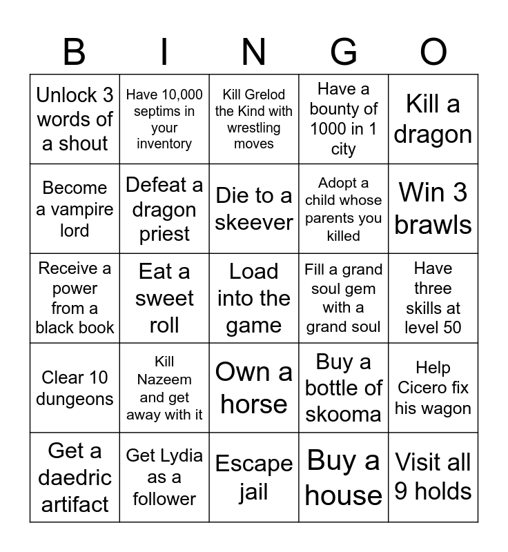 This bingo card has a free space and 24 words: Kill Nazeem and get away with it, Get Lydia as a follower, Die to a skeever, Get a daedric artifact, Kill a dragon, Unlock 3 words of a shout, Become a vampire lord, Have 10,000 septims in your inventory, Fill a grand soul gem with a grand soul, Own a horse, Adopt a child whose parents you killed, Receive a power from a black book, Buy a bottle of skooma, Help Cicero fix his wagon, Defeat a dragon priest, Buy a house, Have three skills at level 50, Kill Grelod the Kind with wrestling moves, Win 3 brawls, Eat a sweet roll, Visit all 9 holds, Clear 10 dungeons, Have a bounty of 1000 in 1 city and Escape jail.