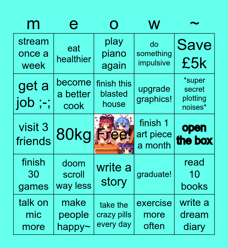This bingo card has a free space and 24 words: doom scroll way less, make people happy~, finish this blasted house, talk on mic more, Save £5k, stream once a week, get a job ;-;, eat healthier, finish 1 art piece a month, write a story, upgrade graphics!, visit 3 friends, graduate!, read 10 books, become a better cook, exercise more often, open the box, play piano again, *super secret plotting noises*, 80kg, write a dream diary, finish 30 games, do something impulsive and take the crazy pills every day.