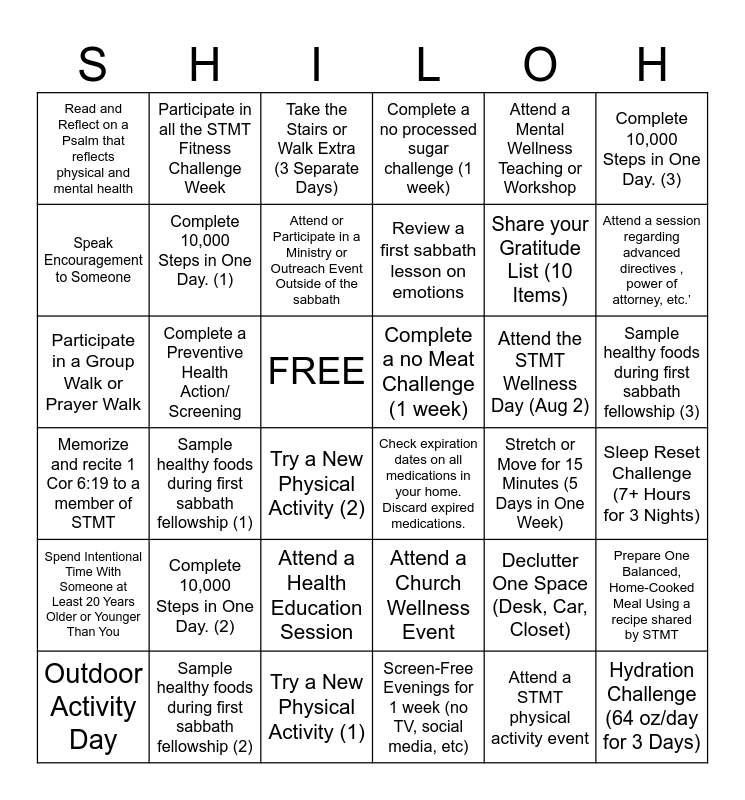 This bingo card has 36 words: Attend a Church Wellness Event, Attend a Health Education Session, Screen-Free Evenings for 1 week (no TV, social media, etc), Speak Encouragement to Someone, Memorize and recite 1 Cor 6:19 to a member of STMT, Complete a no Meat Challenge (1 week), Complete 10,000 Steps in One Day. (1), Try a New Physical Activity (1), Attend a Mental Wellness Teaching or Workshop, Declutter One Space (Desk, Car, Closet), Attend a session regarding advanced directives , power of attorney, etc.’, Complete a no processed sugar challenge (1 week), Prepare One Balanced, Home-Cooked Meal Using a recipe shared by STMT, Complete a Preventive Health Action/ Screening, Review a first sabbath lesson on emotions, Read and Reflect on a Psalm that reflects physical and mental health, Spend Intentional Time With Someone at Least 20 Years Older or Younger Than You, Attend the STMT Wellness Day (Aug 2), Participate in a Group Walk or Prayer Walk, Take the Stairs or Walk Extra (3 Separate Days), FREE, Sample healthy foods during first sabbath fellowship (1), Check expiration dates on all medications in your home. Discard expired medications., Try a New Physical Activity (2), Stretch or Move for 15 Minutes (5 Days in One Week), Participate in all the STMT Fitness Challenge Week, Share your Gratitude List (10 Items), Sample healthy foods during first sabbath fellowship (2), Attend or Participate in a Ministry or Outreach Event Outside of the sabbath, Complete 10,000 Steps in One Day. (3), Hydration Challenge (64 oz/day for 3 Days), Outdoor Activity Day, Sleep Reset Challenge (7+ Hours for 3 Nights), Sample healthy foods during first sabbath fellowship (3), Complete 10,000 Steps in One Day. (2) and Attend a STMT physical activity event.