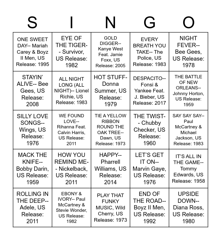 This bingo card has 72 words: HOW DEEP IS YOUR LOVE-- Bee Gees, US Release: 1977, EYE OF THE TIGER-- Survivor, US Release: 1982, WE FOUND LOVE-- Rihanna Feat. Calvin Harris, US Release: 2011, LOW-- Flo Rida Feat. T-Pain, US Release: 2008, JUST WANT TO BE YOUR EVERYTHING-- Andy Gibb, US Release: 1977, TOO CLOSE-- Next, US Release: 1998, EVERY BREATH YOU TAKE-- The Police, US Release: 1983, SOMEBODY THAT I USED TO KNOW-- Gotye / Kimbra, US Release: 2012, DESPACITO-- Fonsi & Yankee Feat. J. Bieber, US Release: 2017, FLASHDANCE… WHAT A FEELING-- Irene Cara, US Release: 1983, ROLLING IN THE DEEP-- Adele, US Release: 2011, TOSSIN’ AND TURNIN’-- Bobby Lewis, US Release: 1961, THE BATTLE OF NEW ORLEANS-- Johnny Horton, US Release: 1959, ONE SWEET DAY-- Mariah Carey & Boyz II Men, US Release: 1995, TRULY MADLY DEEPLY-- Savage Garden, US Release: 1998, SILLY LOVE SONGS-- Wings, US Release: 1976, LET’S GET IT ON-- Marvin Gaye, US Release: 1976, NIGHT FEVER-- Bee Gees, US Release: 1978, ANOTHER ONE BITES THE DUST-- Queen, US Release: 1980, SAY SAY SAY-- Paul McCartney & Michael Jackson, US Release: 1983, HOW YOU REMIND ME-- Nickelback, US Release: 2011, TIE A YELLOW RIBBON ROUND THE OAK TREE-- Dawn, US Release: 1973, IT’S ALL IN THE GAME-- Tommy Edwards, US Release: 1958, I WANT TO HOLD YOUR HAND-- The Beatles, US Release: 1964, SHADOW DANCING- Andy Gibb, US Release: 1978, CALL ME MAYBE-- Carly Rae Jepsen, US Release: 2012, BLURRED LINES-- Robin Thicke Feat TI + Pharrell, US Release: 2013, CANDLE IN THE WIND-- Elton John, US Release: 1997, NO ONE-- Alicia Keys, US Release: 2007, MOVES LIKE JAGGER-- Maroon 5 Feat. Christina Aguilera, US Release: 2011, EBONY & IVORY-- Paul McCartney & Stevie Wonder, US Release: 1982, RUSH RUSH-- Paula Abdul, US Release: 1991, THAT’S WHAT FRIENDS ARE FOR-- Dionne & Friends, US Release: 1986, I WILL ALWAYS LOVE YOU-- Whitney Houston, US Release: 1992, END OF THE ROAD-- Boyz II Men, US Release: 1992, BOOM BOOM POW-- The Black Eyed Peas, US Release: 2009, CALL ME-- Blondie, US Release: 1980, LET ME LOVE YOU--Mario, US Release: 2005, STAYIN’ ALIVE-- Bee Gees, US Release: 2008, LADY-- Kenny Rogers, US Release: 1980, HAPPY-- Pharrell Williams, US Release: 2014, UPSIDE DOWN-- Diana Ross, US Release: 1980, SUGAR, SUGAR-- The Archies, US Release: 1969, JUST THE WAY YOU ARE-- Bruno Mars, US Release: 2010, SMOOTH-- Santana Feat. Rob Thomas, US Release: 1999, MACK THE KNIFE-- Bobby Darin, US Release: 1959, UPTOWN FUNK!-- Mark Ronson Feat. Bruno Mars, US Release: 2015, HOW DO I LIVE-- Leann Rimes, US Release: 1997, DILEMMA-- Nelly Feat. Kelly Rowland, US Release: 2002, I HEARD IT THROUGH THE GRAPEVINE-- Marvin Gaye, US Release: 1968, YOU’RE STILL THE ONE-- Shania Twain, US Release: 1998, BILLIE JEAN-- Michael Jackson, US Release: 1983, WAITING FOR A GIRL LIKE YOU-- Foreigner, US Release: 1981, THE TWIST-- Chubby Checker, US Release: 1960, TIK TOK-- KeSha, US Release: 2010, I’M A BELIEVER-- The Monkees, US Release: 1966, GOLD DIGGER-- Kanye West Feat. Jamie Foxx, US Release: 2005, HOT STUFF- Donna Summer, US Release: 1979, ROCKSTAR-- Post Malone Feat. 21 Savage, US Release: 2017, GANGSTA’S PARADISE-- Coolio Feat. L.V., US Release: 1995, ABRACADABRA-- The Steve Miller Band, US Release: 1982, PERFECT-- Ed Sheeran, US Release: 2017, YOU’RE SO VAIN-- Carly Simon, US Release: 1973, PLAY THAT FUNKY MUSIC, Wild Cherry, US Release: 1973, SAY YOU, SAY ME-- Lionel Richie, US Release: 1985, MY SHARONA-- The Knack, US Release: 1979, ALL NIGHT LONG (ALL NIGHT)-- Lionel Richie, US Release: 1983, NOTHING COMPARES 2 U-- Sinead O’Connor, US Release: 1990, I SWEAR-- All-4-One, US Release: 1994, FAMILY AFFAIR-- Mary J. Blige, US Release: 2001, APOLOGIZE-- Timbaland Feat. OneRepublic, US Release: 2007 and WHOOMP!-- Tag Team, US Release: 1993.