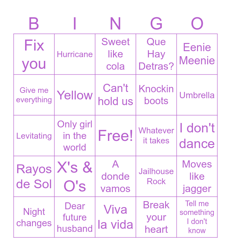 This bingo card has a free space and 26 words: A donde vamos, Break your heart, Can't hold us, Dear future husband, Eenie Meenie, Fix you, Give me everything, Hurricane, I don't dance, Jailhouse Rock, Knockin boots, Levitating, Moves like jagger, Night changes, Only girl in the world, Party in the U.S.A, Que Hay Detras?, Rayos de Sol, Sweet like cola, Tell me something I don't know, Umbrella, Viva la vida, Whatever it takes, X's & O's, Yellow and Zumba.