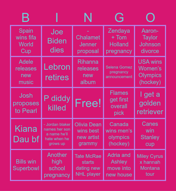 This bingo card has a free space and 24 words: - Jordan blaker names her son a name he’ll hate when he grows up, Another high school pregnancy, Rihanna releases new album, Bills win Superbowl, Aaron-Taylor Johnson divorce, Spain wins fifa World Cup, Adele releases new music, Joe Biden dies, Flames get first overall pick, Olivia Dean wins best new artist grammy, Selena Gomez pregnancy announcement, Josh proposes to Pearl, Canada wins men’s olympics (hockey), Canes win Stanley cup, Lebron retires, Adria and Ashley move into new house, I get a golden retriever, - Chalamet Jenner proposal, USA wins Women’s Olympics (hockey), P diddy killed, Miley Cyrus x hannah Montana tour, Kiana Dau bf, Zendaya + Tom Holland pregnancy and Tate McRae starts dating new NHL player.