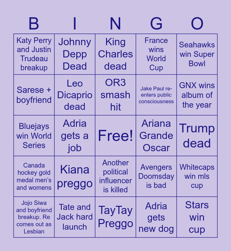 This bingo card has a free space and 24 words: Kiana preggo, Tate and Jack hard launch, OR3 smash hit, Jojo Siwa and boyfriend breakup. Re comes out as Lesbian, Seahawks win Super Bowl, Katy Perry and Justin Trudeau breakup, Sarese + boyfriend, Johnny Depp Dead, Ariana Grande Oscar, Another political influencer is killed, Jake Paul re-enters public consciousness, Bluejays win World Series, Avengers Doomsday is bad, Whitecaps win mls cup, Leo Dicaprio dead, Adria gets new dog, Trump dead, King Charles dead, GNX wins album of the year, Adria gets a job, Stars win cup, Canada hockey gold medal men’s and womens, France wins World Cup and TayTay Preggo.
