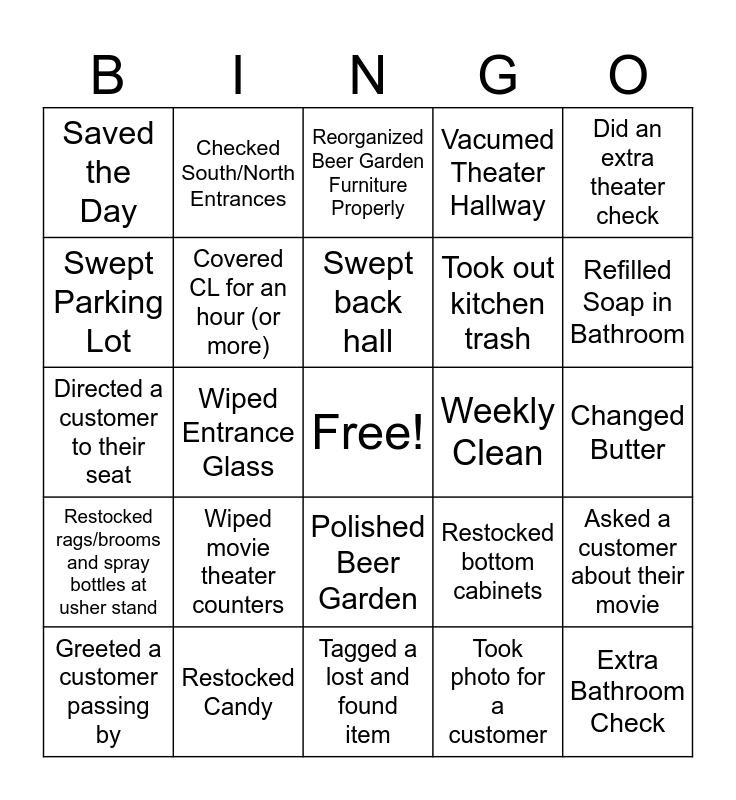 This bingo card has a free space and 26 words: Polished Beer Garden, Took photo for a customer, Swept back hall, Restocked Candy, Did an extra theater check, Saved the Day, Swept Parking Lot, Checked South/North Entrances, Changed Butter, Restocked bottom cabinets, Took out kitchen trash, Directed a customer to their seat, Asked a customer about their movie, Greeted a customer passing by, Wiped Entrance Glass, Swept underneath black cabinets, Vacumed Theater Hallway, Restocked rags/brooms and spray bottles at usher stand, Reorganized Beer Garden Furniture Properly, Extra Bathroom Check, Refilled Soap in Bathroom, Tagged a lost and found item, Weekly Clean, Wiped movie theater counters, Covered CL for an hour (or more) and Cleaned Trash Cart.