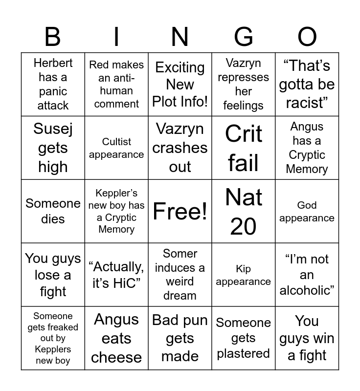 This bingo card has a free space and 24 words: “Actually, it’s HiC”, Angus eats cheese, Vazryn crashes out, Someone gets freaked out by Kepplers new boy, “That’s gotta be racist”, Herbert has a panic attack, Susej gets high, Red makes an anti-human comment, Nat 20, Somer induces a weird dream, Crit fail, Someone dies, Kip appearance, “I’m not an alcoholic”, Cultist appearance, Someone gets plastered, God appearance, Exciting New Plot Info!, Angus has a Cryptic Memory, Keppler’s new boy has a Cryptic Memory, You guys win a fight, You guys lose a fight, Vazryn represses her feelings and Bad pun gets made.