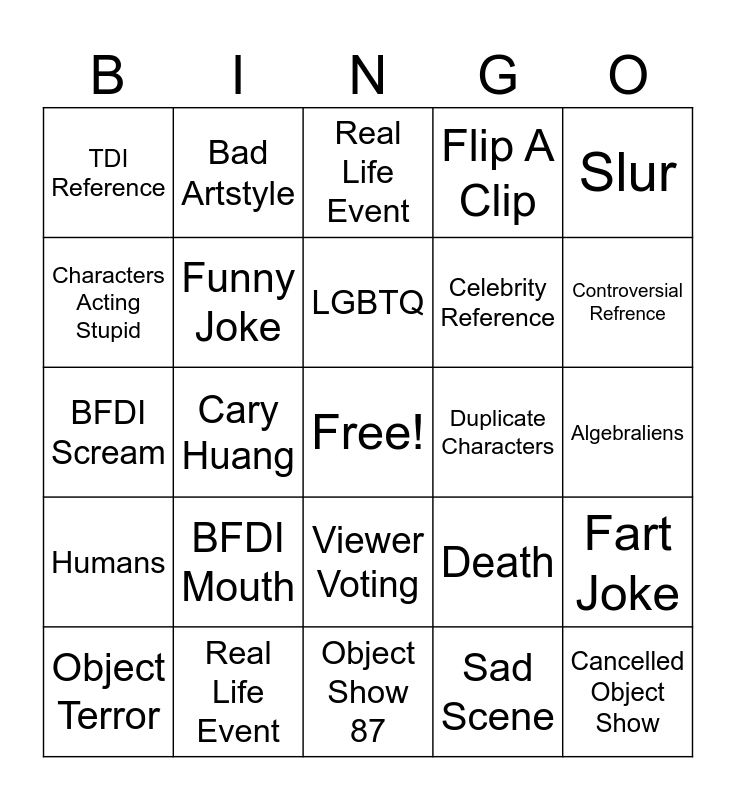 This bingo card has a free space and 24 words: BFDI Mouth, Real Life Event, LGBTQ, Object Terror, Slur, TDI Reference, Characters Acting Stupid, Bad Artstyle, Duplicate Characters, Viewer Voting, Celebrity Reference, BFDI Scream, Death, Fart Joke, Funny Joke, Sad Scene, Algebraliens, Real Life Event, Controversial Refrence, Cary Huang, Cancelled Object Show, Humans, Flip A Clip and Object Show 87.