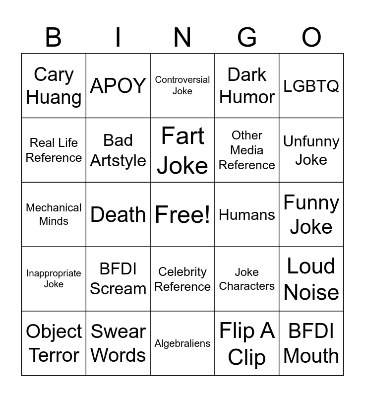 This bingo card has a free space and 24 words: BFDI Scream, Swear Words, Fart Joke, Object Terror, LGBTQ, Cary Huang, Real Life Reference, APOY, Humans, Celebrity Reference, Other Media Reference, Mechanical Minds, Joke Characters, Loud Noise, Bad Artstyle, Flip A Clip, Funny Joke, Controversial Joke, Unfunny Joke, Death, BFDI Mouth, Inappropriate Joke, Dark Humor and Algebraliens.