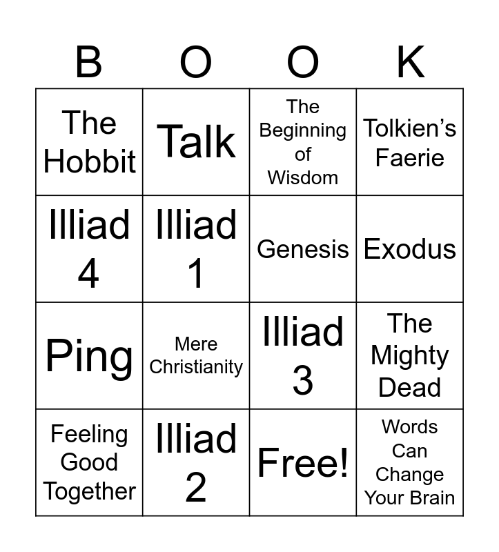 This bingo card has 17 words: Free!, Feeling Good Together, The Beginning of Wisdom, The Hobbit, Mere Christianity, Tolkien’s Faerie, The Mighty Dead, Genesis, Exodus, Illiad 1, Illiad 2, Illiad 3, Illiad 4, Talk, Ping, Superbetter and Words Can Change Your Brain.
