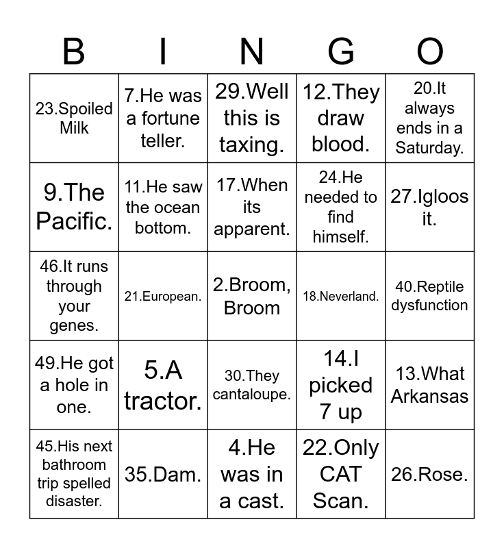 This bingo card has 50 words: 1.Prime Mates, 2.Broom, Broom, 3.A stick., 4.He was in a cast., 5.A tractor., 6.They rise to the top every time., 7.He was a fortune teller., 8.“you’re under a vest”, 9.The Pacific., 10.Baaad to the Bone., 11.He saw the ocean bottom., 12.They draw blood., 13.What Arkansas, 14.I picked 7 up, 15.They use honey combs, 16.The bark., 17.When its apparent., 18.Neverland., 19.He got his quarter back., 20.It always ends in a Saturday., 21.European., 22.Only CAT Scan., 23.Spoiled Milk, 24.He needed to find himself., 25.Doggy Paddle., 26.Rose., 27.Igloos it., 28.Hip Pop, 29.Well this is taxing., 30.They cantaloupe., 31.Urine Trouble., 32.It got toad., 33.Eclipse it., 34.They taste funny., 35.Dam., 36.Nothing – its on the house., 37.It was chewy., 38.He turned himself around., 39.A dirty yolk., 40.Reptile dysfunction, 41.He has floppy discs, 42.His program was only two-step., 43.They have big fingers., 44.She had to check her balance., 45.His next bathroom trip spelled disaster., 46.It runs through your genes., 47.A Booby Trap., 48.A Private Tutor, 49.He got a hole in one. and 50.Ground Beef..