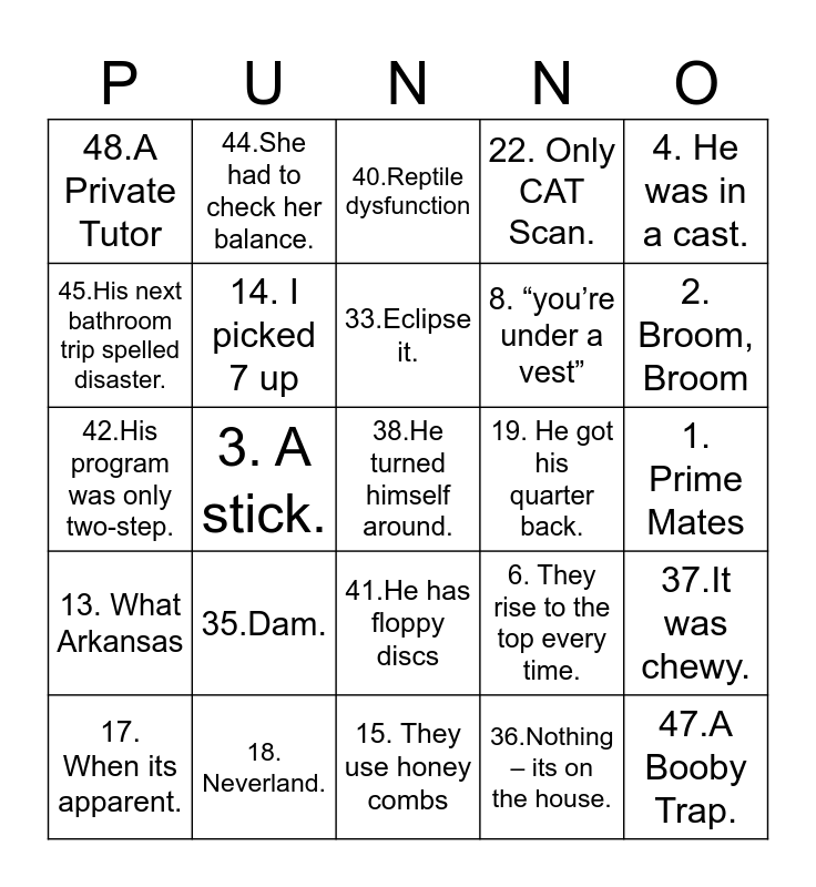 This bingo card has 42 words: 32.It got toad., 33.Eclipse it., 34.They taste funny., 35.Dam., 36.Nothing – its on the house., 37.It was chewy., 38.He turned himself around., 39.A dirty yolk., 40.Reptile dysfunction, 41.He has floppy discs, 1. Prime Mates, 2. Broom, Broom, 3. A stick., 4. He was in a cast., 5. A tractor., 6. They rise to the top every time., 7. He was a fortune teller., 42.His program was only two-step., 43.They have big fingers., 44.She had to check her balance., 45.His next bathroom trip spelled disaster., 46.It runs through your genes., 47.A Booby Trap., 48.A Private Tutor, 49.He got a hole in one., 50.Ground Beef., 8. “you’re under a vest”, 9. The Pacific., 10. Baaad to the Bone., 11. He saw the ocean bottom., 12. They draw blood., 13. What Arkansas, 14. I picked 7 up, 15. They use honey combs, 16. The bark., 17. When its apparent., 18. Neverland., 19. He got his quarter back., 20. It always ends in a Saturday., 21. European., 22. Only CAT Scan. and 23. Spoiled Milk.