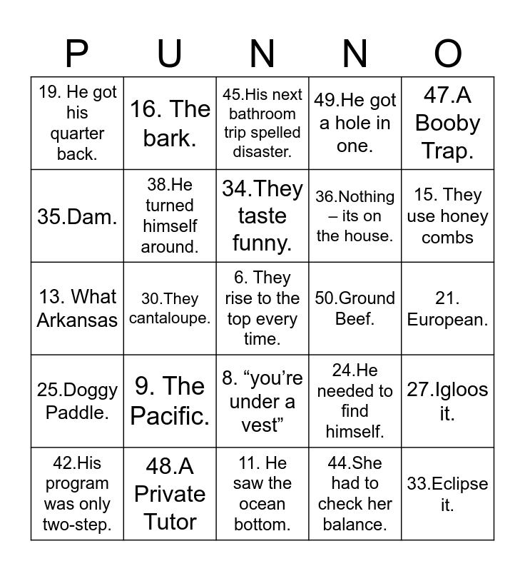 This bingo card has 44 words: 5. A tractor., 6. They rise to the top every time., 7. He was a fortune teller., 42.His program was only two-step., 43.They have big fingers., 44.She had to check her balance., 45.His next bathroom trip spelled disaster., 46.It runs through your genes., 47.A Booby Trap., 48.A Private Tutor, 49.He got a hole in one., 50.Ground Beef., 8. “you’re under a vest”, 9. The Pacific., 10. Baaad to the Bone., 11. He saw the ocean bottom., 12. They draw blood., 13. What Arkansas, 14. I picked 7 up, 15. They use honey combs, 16. The bark., 17. When its apparent., 18. Neverland., 19. He got his quarter back., 20. It always ends in a Saturday., 21. European., 22. Only CAT Scan., 23. Spoiled Milk, 24.He needed to find himself., 25.Doggy Paddle., 26.Rose., 27.Igloos it., 28.Hip Pop, 29.Well this is taxing., 30.They cantaloupe., 31.Urine Trouble., 32.It got toad., 33.Eclipse it., 34.They taste funny., 35.Dam., 36.Nothing – its on the house., 37.It was chewy., 38.He turned himself around. and 39.A dirty yolk..