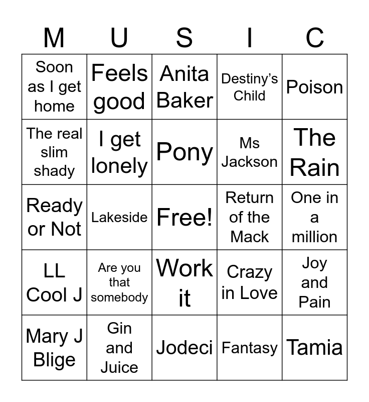 This bingo card has a free space and 34 words: Keith Sweat, Fantasy, Hold on, Too Close, LL Cool J, I get lonely, Poison, Mary J Blige, Feels good, Salt n Peppa, Pony, Anita Baker, 702, Usher, Return of the Mack, The Rain, Gin and Juice, Ready or Not, Are you that somebody, Crazy in Love, Work it, Brandy, Soon as I get home, One in a million, Jodeci, Tamia, Destiny’s Child, Ashanti, Ms Jackson, The real slim shady, My Prerogative, Lakeside, Joy and Pain and When I think of you.