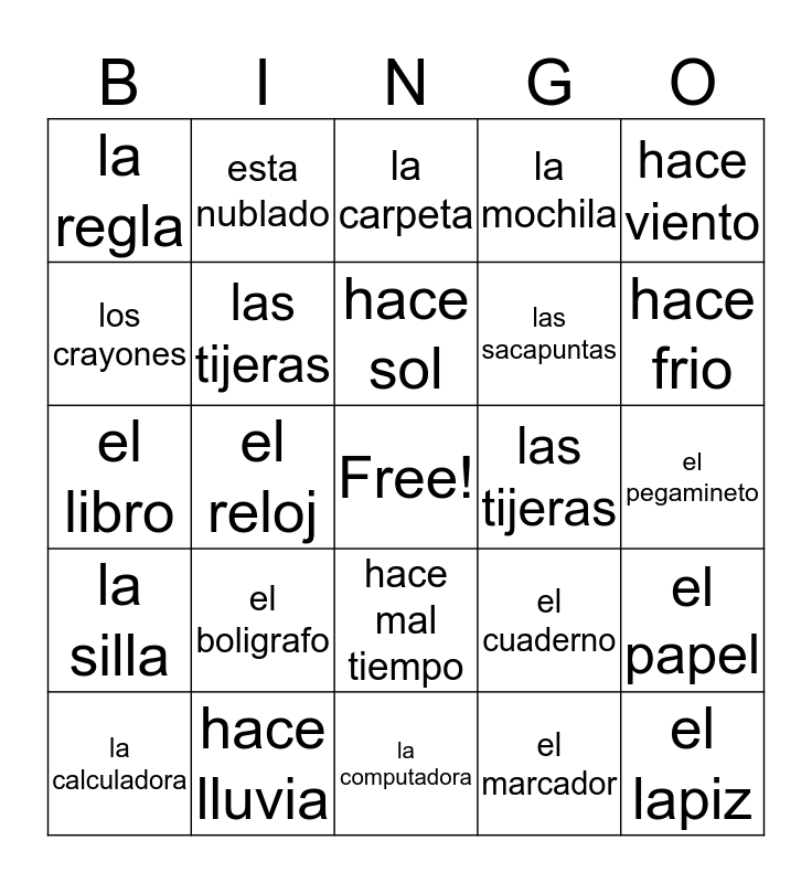 This bingo card has a free space and 24 words: el boligrafo, hace lluvia, hace sol, la calculadora, hace viento, la regla, los crayones, esta nublado, las tijeras, hace mal tiempo, las sacapuntas, el libro, el cuaderno, el papel, las tijeras, el marcador, el pegamineto, la carpeta, hace frio, el reloj, el lapiz, la silla, la mochila and la computadora.