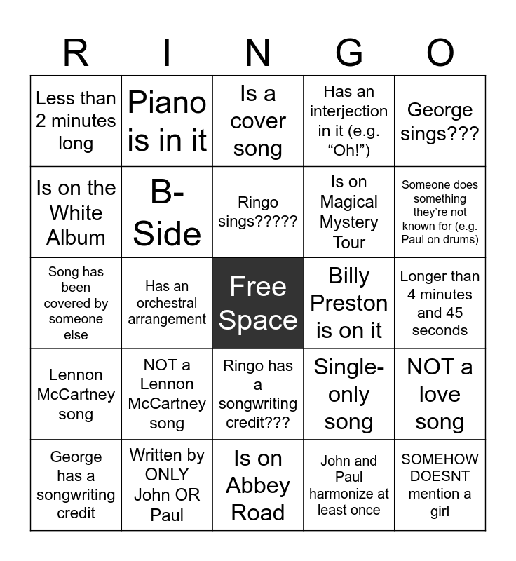 This bingo card has a free space and 24 words: NOT a Lennon McCartney song, Written by ONLY John OR Paul, Ringo sings?????, George has a songwriting credit, George sings???, Less than 2 minutes long, Is on the White Album, Piano is in it, Billy Preston is on it, Ringo has a songwriting credit???, Is on Magical Mystery Tour, Song has been covered by someone else, Single-only song, NOT a love song, B-Side, John and Paul harmonize at least once, Longer than 4 minutes and 45 seconds, Is a cover song, Someone does something they’re not known for (e.g. Paul on drums), Has an orchestral arrangement, SOMEHOW DOESNT mention a girl, Lennon McCartney song, Has an interjection in it (e.g. “Oh!”) and Is on Abbey Road.