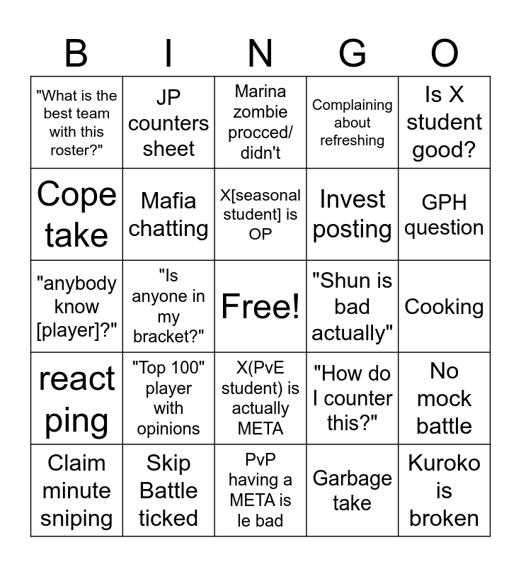 This bingo card has a free space and 50 words: Delete Shun, Kuroko is broken, RNG game mode, PvP having a META is le bad, "Top 100" player with opinions, Lacks core students/ investment, JP counters sheet, "PvP rewards suck", Cope take, GPD take, Mafia chatting, Complaining about refreshing, No mock battle, "How do I counter this?", #PvP main wishful thinking, Abandoned mode, X[seasonal student] is OP, "Shun is bad actually", Attack record no explanation, Is X student good?, "Is anyone in my bracket?", Garbage take, "What is the best team with this roster?", Invest posting, Unlucky & complaining, "What do those abbreviations mean?", GPH question, off topic, Marina zombie procced/ didn't, X(PvE student) is actually META, Rage refresher posting, Mod talks in channel, "When is next season?", "What is next season META?", Skip Battle ticked, Censors names, "Chance to brick", I got hit X times, Pathing jank, Cooking, Strat debate, Student debate, "Can't afford that invest", Bad advice given earnestly, Claim minute sniping, "anybody know [player]?", Delete PvP, :Emoji: only, react ping and Anon defence.