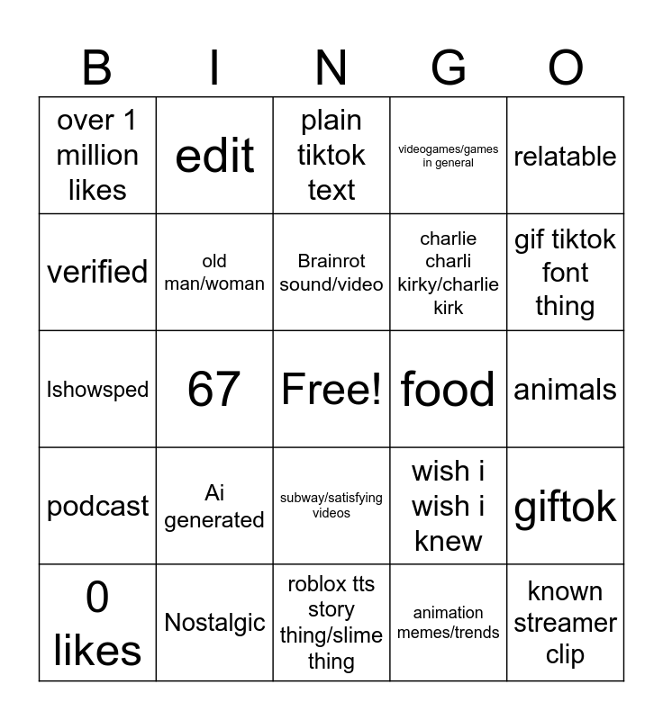 This bingo card has a free space and 24 words: Ai generated, Nostalgic, Brainrot sound/video, 0 likes, relatable, over 1 million likes, verified, edit, food, subway/satisfying videos, charlie charli kirky/charlie kirk, Ishowsped, wish i wish i knew, giftok, old man/woman, animation memes/trends, animals, plain tiktok text, gif tiktok font thing, 67, known streamer clip, podcast, videogames/games in general and roblox tts story thing/slime thing.