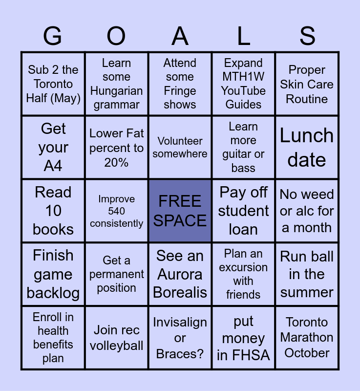 This bingo card has a free space and 24 words: Get a permanent position, Join rec volleyball, Volunteer somewhere, Enroll in health benefits plan, Proper Skin Care Routine, Sub 2 the Toronto Half (May), Get your A4, Learn some Hungarian grammar, Pay off student loan, See an Aurora Borealis, Learn more guitar or bass, Read 10 books, Plan an excursion with friends, Run ball in the summer, Lower Fat percent to 20%, put money in FHSA, No weed or alc for a month, Attend some Fringe shows, Lunch date, Improve 540 consistently, Toronto Marathon October, Finish game backlog, Expand MTH1W YouTube Guides and Invisalign or Braces?.