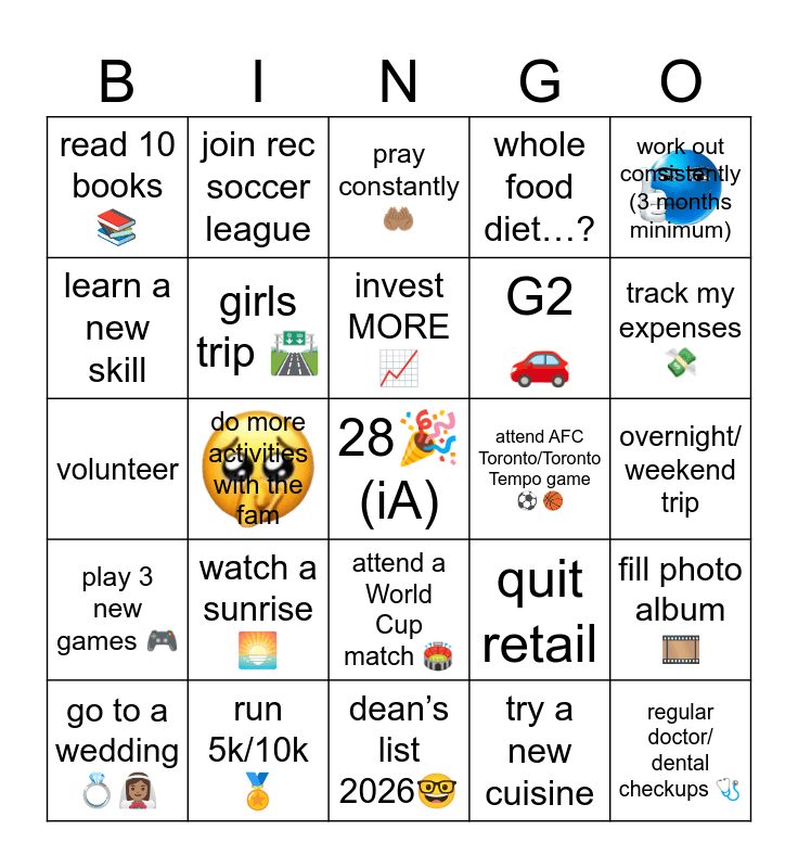 This bingo card has 2 images, a free space and 24 words: watch a sunrise ๐ , run 5k/10k ๐ , invest MORE ๐, go to a wedding ๐๐ฐ๐ฝโโ๏ธ, work out consistently (3 months minimum), read 10 books ๐, learn a new skill, join rec soccer league, attend AFC Toronto/Toronto Tempo game โฝ๏ธ ๐, attend a World Cup match ๐๏ธ, G2 ๐, volunteer, quit retail, fill photo album๐๏ธ, girls trip ๐ฃ๏ธ, try a new cuisine, overnight/ weekend trip, pray constantly ๐คฒ๐ฝ, track my expenses ๐ธ, do more activities with the fam, regular doctor/ dental checkups ๐ฉบ, play 3 new games ๐ฎ, whole food dietโฆ? and deanโs list 2026๐ค.