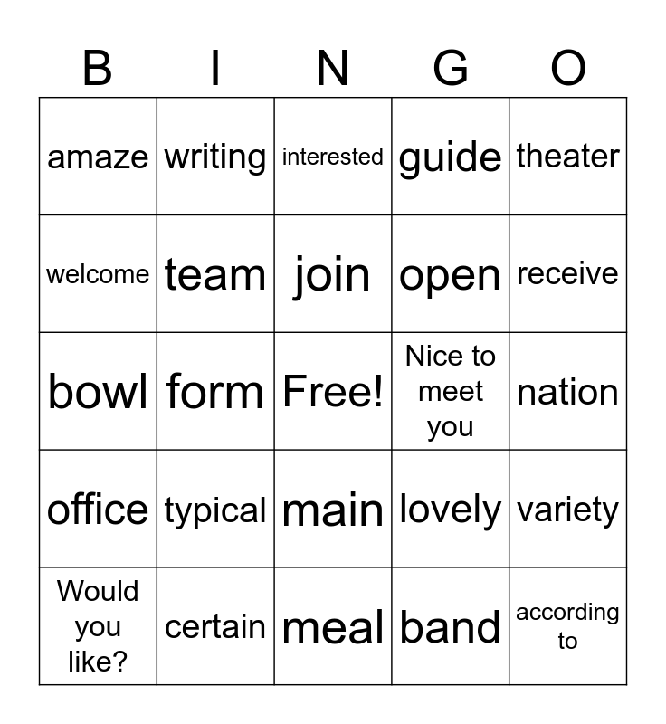 This bingo card has a free space and 32 words: band, club, form, list, office, team, theater, variety, writing, fill in, join, interested, around here, I'd love to, Nice to meet you, What about?, Would you like?, bowl, main, typical, lovely, serve, nation, certain, according to, guide, open, welcome, amaze, meal, world and receive.