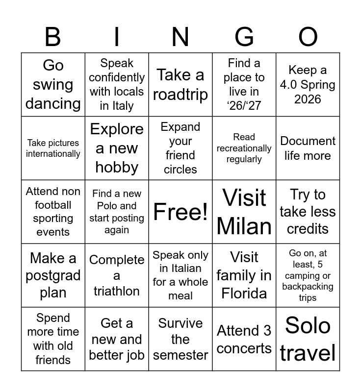 This bingo card has a free space and 24 words: Complete a triathlon, Get a new and better job, Expand your friend circles, Spend more time with old friends, Keep a 4.0 Spring 2026, Go swing dancing, Take pictures internationally, Speak confidently with locals in Italy, Visit Milan, Speak only in Italian for a whole meal, Read recreationally regularly, Attend non football sporting events, Visit family in Florida, Go on, at least, 5 camping or backpacking trips, Explore a new hobby, Attend 3 concerts, Try to take less credits, Take a roadtrip, Document life more, Find a new Polo and start posting again, Solo travel, Make a postgrad plan, Find a place to live in ‘26/‘27 and Survive the semester.