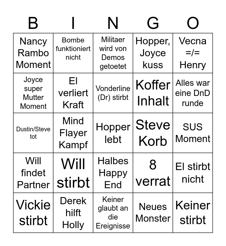 This bingo card has a free space and 24 words: Will stirbt, Derek hilft Holly, Vonderline (Dr) stirbt, Vickie stirbt, Vecna =/= Henry, Nancy Rambo Moment, Joyce super Mutter Moment, Bombe funktioniert nicht, Steve Korb, Halbes Happy End, Koffer Inhalt, Dustin/Steve tot, 8 verrat, El stirbt nicht, El verliert Kraft, Neues Monster, SUS Moment, Militaer wird von Demos getoetet, Alles war eine DnD runde, Mind Flayer Kampf, Keiner stirbt, Will findet Partner, Hopper, Joyce kuss and Keiner glaubt an die Ereignisse.