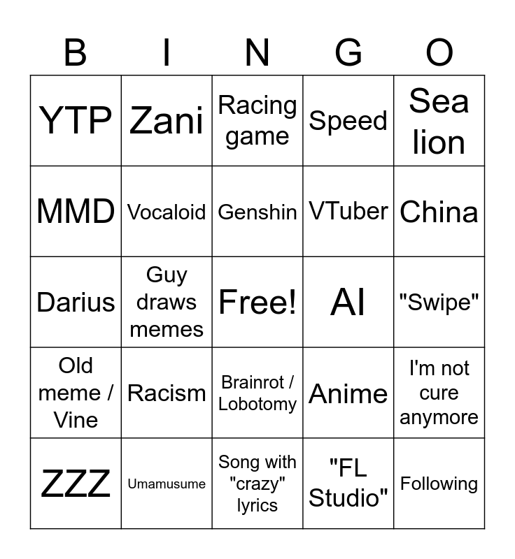This bingo card has a free space and 24 words: Racism, Umamusume, Genshin, ZZZ, Sea lion, YTP, MMD, Zani, AI, Brainrot / Lobotomy, VTuber, Darius, Anime, I'm not cure anymore, Vocaloid, "FL Studio", "Swipe", Racing game, China, Guy draws memes, Following, Old meme / Vine, Speed and Song with "crazy" lyrics.
