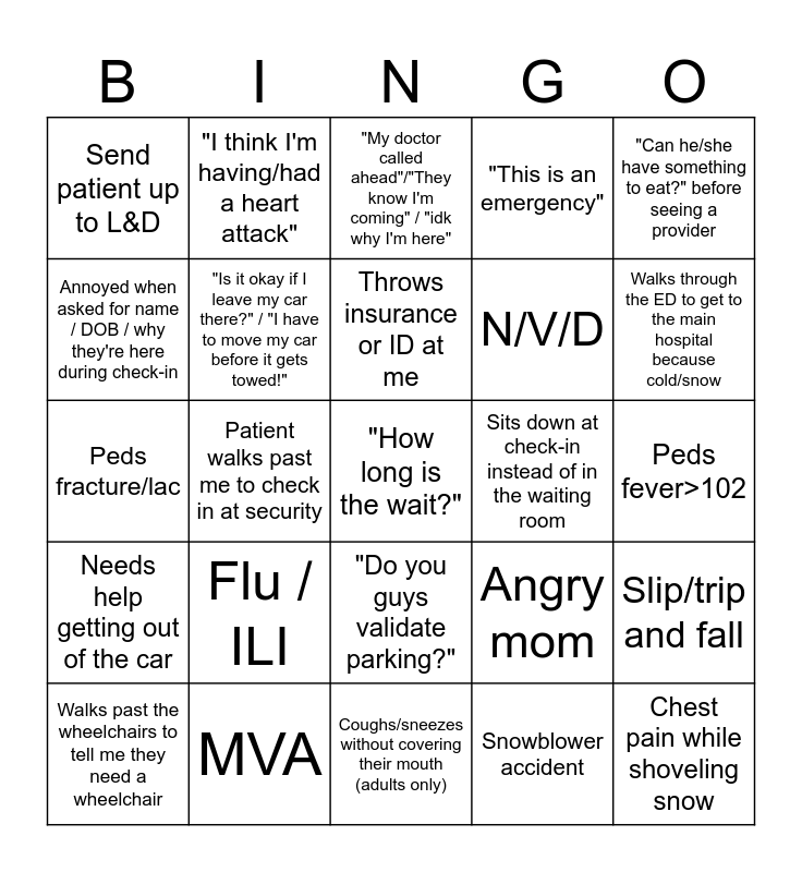 This bingo card has a free space and 24 words: Walks past the wheelchairs to tell me they need a wheelchair, Flu / ILI, Throws insurance or ID at me, Snowblower accident, "Can he/she have something to eat?" before seeing a provider, Send patient up to L&D, "I think I'm having/had a heart attack", "My doctor called ahead"/"They know I'm coming" / "idk why I'm here", Sits down at check-in instead of in the waiting room, Peds fever>102, Peds fracture/lac, "Is it okay if I leave my car there?" / "I have to move my car before it gets towed!", Angry mom, Slip/trip and fall, Annoyed when asked for name / DOB / why they're here during check-in, MVA, Coughs/sneezes without covering their mouth (adults only), "This is an emergency", Walks through the ED to get to the main hospital because cold/snow, Needs help getting out of the car, Patient walks past me to check in at security, "Do you guys validate parking?", N/V/D and Chest pain while shoveling snow.