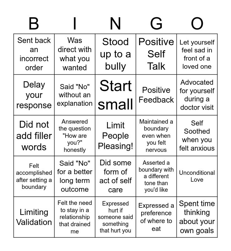 This bingo card has a free space and 30 words: Felt the need to stay in a relationship that drained me, Vocally disagreed with someone's opinion, Answered the question "How are you?" honestly, Spent time with someone without trying to fix something, Sent back an incorrect order, Stood up to a bully, Said "No" without an explanation, Did some form of act of self care, Maintained a boundary even when you felt nervous, Expressed hurt if someone said something that hurt you, Self Soothed when you felt anxious, Spent time thinking about your own goals, Expressed a preference of where to eat, Corrected someone who said your name wrong, Advocated for yourself during a doctor visit, Took time to yourself, Asserted a boundary with a different tone than you'd like, Felt accomplished after setting a boundary, Said "No" for a better long term outcome, Let yourself feel sad in front of a loved one, Did not add filler words, Consequences of People Pleasing, Was direct with what you wanted, Positive Feedback, Delay your response, Positive Self Talk, Unconditional Love, Limiting Validation, Start small and Compromising values.