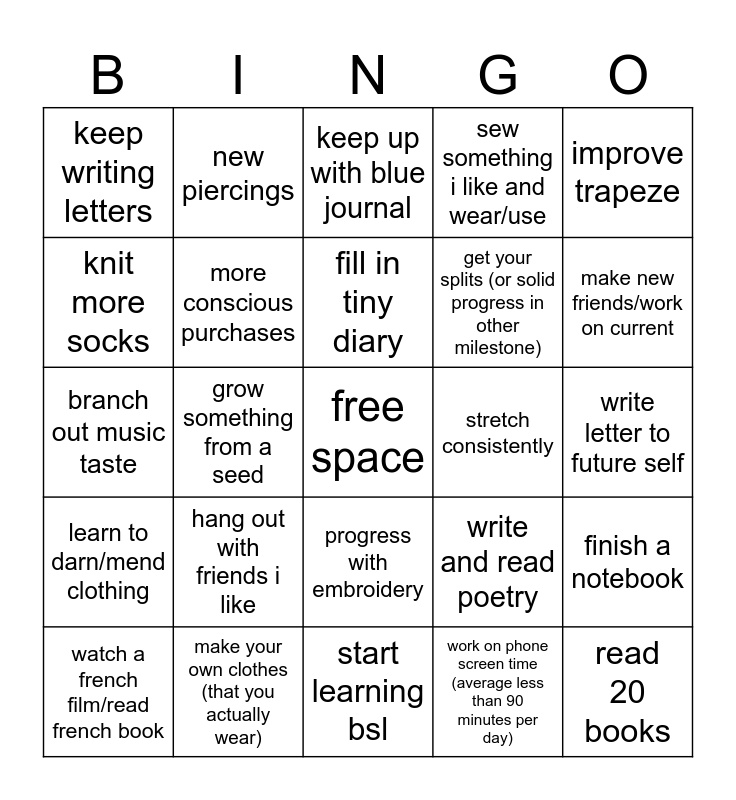 This bingo card has a free space and 24 words: hang out with friends i like, make your own clothes (that you actually wear), fill in tiny diary, watch a french film/read french book, improve trapeze, keep writing letters, knit more socks, new piercings, stretch consistently, progress with embroidery, get your splits (or solid progress in other milestone), branch out music taste, write and read poetry, finish a notebook, more conscious purchases, work on phone screen time (average less than 90 minutes per day), write letter to future self, keep up with blue journal, make new friends/work on current, grow something from a seed, read 20 books, learn to darn/mend clothing, sew something i like and wear/use and start learning bsl.