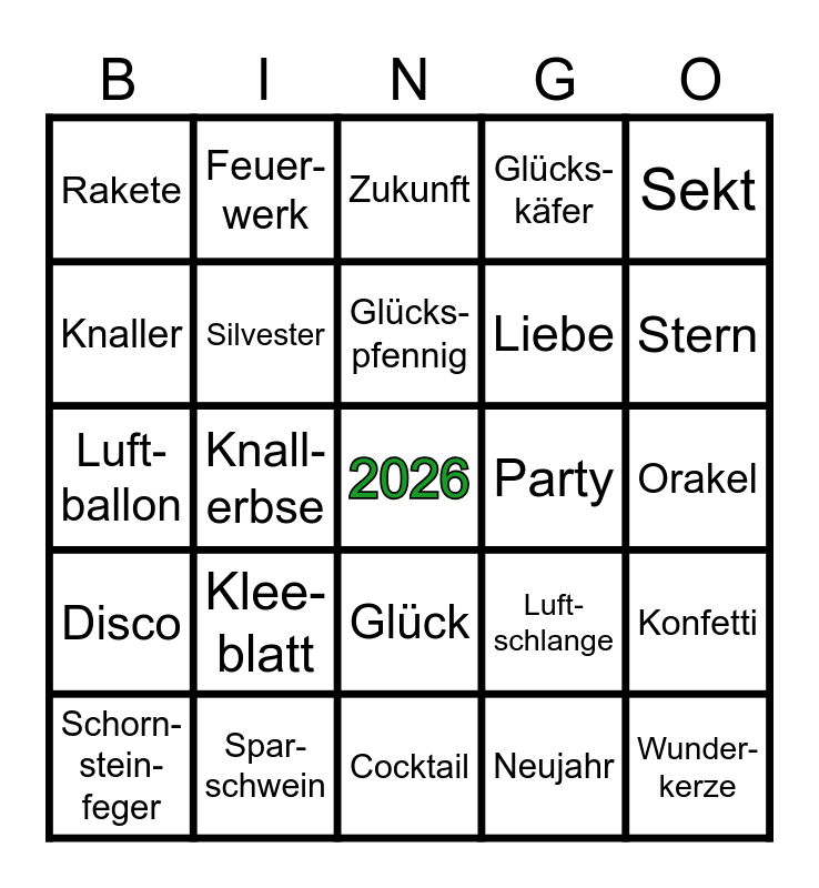 This bingo card has a free space and 24 words: Klee-blatt, Spar-schwein, Glücks-pfennig, Schorn-stein-feger, Sekt, Rakete, Knaller, Feuer-werk, Party, Glück, Liebe, Luft-ballon, Luft-schlange, Konfetti, Silvester, Neujahr, Orakel, Zukunft, Stern, Knall-erbse, Wunder-kerze, Disco, Glücks-käfer and Cocktail.