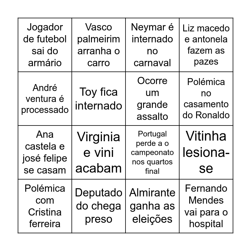 This bingo card has 16 words: Deputado do chega preso, Vitinha lesiona-se, Neymar é internado no carnaval, Jogador de futebol sai do armário, Ana castela e josé felipe se casam, Vasco palmeirim arranha o carro, Portugal perde a o campeonato nos quartos final, Almirante ganha as eleições, André ventura é processado, Toy fica internado, Polémica com Cristina ferreira, Liz macedo e antonela fazem as pazes, Virginia e vini acabam, Polémica no casamento do Ronaldo, Ocorre um grande assalto and Fernando Mendes vai para o hospital.