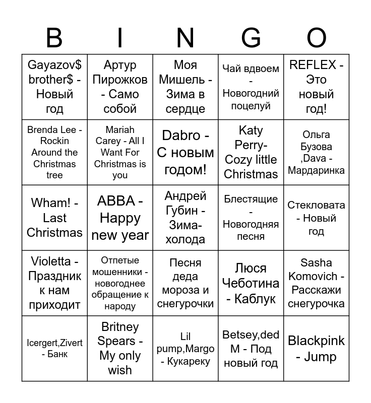 This bingo card has 40 words: Дискотека Авария - Новогодняя, Wham! - Last Christmas, Serebro - Новый год, Mariah Carey - All I Want For Christmas is you, Britney Spears - My only wish, Песня деда мороза и снегурочки, Dabro - С новым годом!, Нина Бродская - Звенит январская вьюга, REFLEX - Это новый год!, Violetta - Праздник к нам приходит, ABBA - Happy new year, Чай вдвоем - Новогодний поцелуй, Андрей Губин - Зима-холода, Стекловата - Новый год, Блестящие - Новогодняя песня, Отпетые мошенники - новогоднее обращение к народу, Людмила Гурченко - 5 минут, Gayazov$ brother$ - Новый год, Джиган,Алсу - Зима, Моя Мишель - Зима в сердце, Sasha Komovich - Расскажи снегурочка, Betsey,ded M - Под новый год, Katy Perry- Cozy little Christmas, Brenda Lee - Rockin Around the Christmas tree, Bobby Holms - Jingle bell rock, Rosé,Bruno Mars - APT, Lady Gaga - Abracadabra, Lola Young - Messy, Blackpink - Jump, Sabrina Carpenter - Espresso, Bad Bunny - Nuevayol, Icergert,Zivert - Банк, Mia Boyka - Базовый минимум, Люся Чеботина - Каблук, Ольга Бузова ,Dava - Мардаринка, Lil pump,Margo - Кукареку, Кэгни,МС дымка - Ворона, Tommy Cash - Espresso Machiato, Артур Пирожков - Само собой and Верка Сердючка - Новогодняя.
