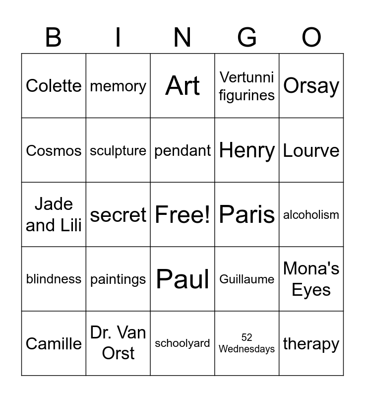 This bingo card has a free space and 28 words: Mona's Eyes, Mona, Henry, 52 Wednesdays, Cosmos, Art, memory, blindness, Paris, Camille, Jade and Lili, Vertunni figurines, Dr. Van Orst, schoolyard, Lourve, Dade, paintings, sculpture, pendant, Paul, Colette, death, therapy, secret, alcoholism, Guillaume, Orsay and Beaubourg.