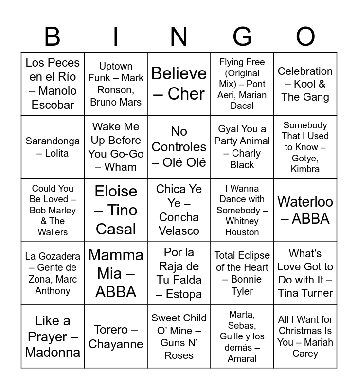 This bingo card has a free space and 59 words: Que La Detengan – David Civera, Torero – Chayanne, Hips Don’t Lie – Shakira, Wyclef Jean, La Gozadera – Gente de Zona, Marc Anthony, Marta, Sebas, Guille y los demás – Amaral, Caminando por la vida – Melendi, Wake Me Up Before You Go-Go – Wham, Livin’ la Vida Loca – Ricky Martin, Gyal You a Party Animal – Charly Black, Quiero Que Vuelvas – Polo Nández, Flying Free (Original Mix) – Pont Aeri, Marian Dacal, Un Planeta Llamado Nosotros – Maldita Nerea, Sarandonga – Lolita, La Marimorena – Demarco Flamenco, Amigos para Siempre – Los Manolos, Los Peces en el Río – Manolo Escobar, All I Want for Christmas Is You – Mariah Carey, Celebration – Kool & The Gang, Walking on Sunshine – Katrina & The Waves, No Controles – Olé Olé, I Wanna Dance with Somebody – Whitney Houston, Believe – Cher, Like a Prayer – Madonna, What’s Love Got to Do with It – Tina Turner, Take On Me – a-ha, Un Beso y Una Flor – Nino Bravo, Baby, I Love Your Way – Big Mountain, Baby, I Love Your Way – Big Mountain, Somebody That I Used to Know – Gotye, Kimbra, Somebody to Love – Queen, Maquillaje – Mecano, Me Colé en una Fiesta – Mecano, Ni tú ni nadie – Alaska y Dinarama, Lobo-hombre en París – La Unión, Uptown Funk – Mark Ronson, Bruno Mars, La Puerta de Alcalá – Ana Belén, Víctor Manuel, YMCA – Village People, Eloise – Tino Casal, Could You Be Loved – Bob Marley & The Wailers, Could You Be Loved – Bob Marley & The Wailers, Gimme! Gimme! Gimme! – ABBA, Mamma Mia – ABBA, Waterloo – ABBA, Sweet Dreams (Are Made of This) – Eurythmics, You’re the One That I Want – John Travolta & Olivia Newton-John, Beat It – Michael Jackson, Ave María – David Bisbal, El Burrito Sabanero – David Bisbal, Por la Raja de Tu Falda – Estopa, Sweet Child O’ Mine – Guns N’ Roses, Milionària – Rosalía, I Was Made for Lovin’ You – Kiss, Losing My Religion – R.E.M, Happy – Pharrell Williams, A quién le importa – Alaska y Dinarama, Total Eclipse of the Heart – Bonnie Tyler, It’s My Life – Bon Jovi, The Final Countdown – Europe and Gyal You a Party Animal – Charly Black.