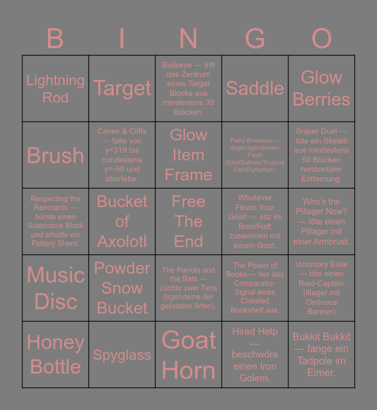 This bingo card has a free space and 24 words: Powder Snow Bucket, Spyglass, Glow Item Frame, Honey Bottle, Glow Berries, Lightning Rod, Brush, Target, Whatever Floats Your Goat! — sitz im Boot/Raft zusammen mit einem Goat., The Parrots and the Bats — züchte zwei Tiere (irgendeine der gelisteten Arten)., Fishy Business — angle irgendeinen Fisch (Cod/Salmon/Tropical Fish/Pufferfish)., Respecting the Remnants — bürste einen Suspicious Block und erhalte ein Pottery Sherd., The Power of Books — lies das Comparator-Signal eines Chiseled Bookshelf aus., Voluntary Exile — töte einen Raid-Captain (Illager mit Ominous Banner), Caves & Cliffs — falle von y=319 bis mindestens y=-59 und überlebe., Hired Help — beschwöre einen Iron Golem., Who’s the Pillager Now? — töte einen Pillager mit einer Armbrust., Bullseye — triff das Zentrum eines Target Blocks aus mindestens 30 Blöcken., Sniper Duel — töte ein Skelett aus mindestens 50 Blöcken horizontaler Entfernung., Bucket of Axolotl, Bukkit Bukkit — fange ein Tadpole im Eimer., Music Disc, Saddle and Goat Horn.