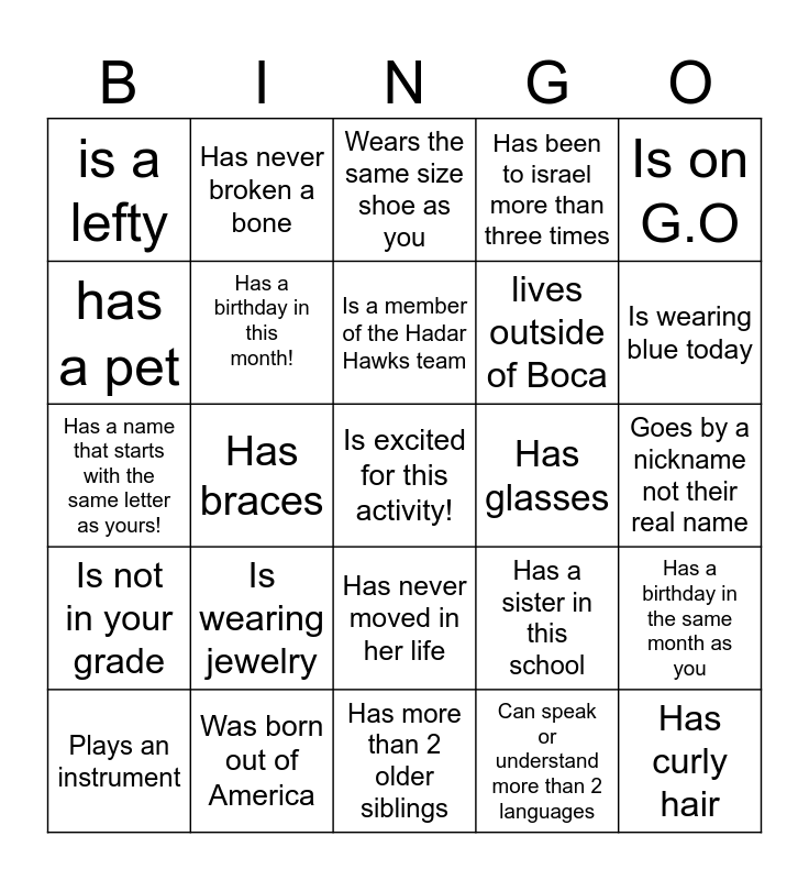 This bingo card has a free space and 24 words: Is wearing jewelry, Was born out of America, Is a member of the Hadar Hawks team, Plays an instrument, Is on G.O, is a lefty, has a pet, Has never broken a bone, Has glasses, Has never moved in her life, lives outside of Boca, Has a name that starts with the same letter as yours!, Has a sister in this school, Has a birthday in the same month as you, Has a birthday in this month!, Can speak or understand more than 2 languages, Goes by a nickname not their real name, Wears the same size shoe as you, Is wearing blue today, Has braces, Has curly hair, Is not in your grade, Has been to israel more than three times and Has more than 2 older siblings.