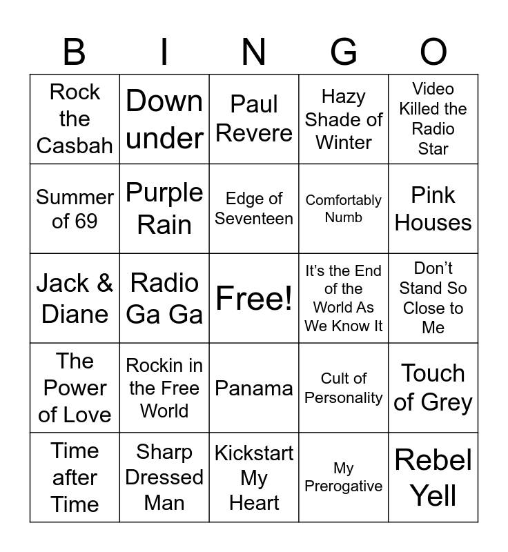 This bingo card has a free space and 34 words: Take on Me, My Prerogative, Everybody Wants to Rule the World, Call Me, The Power of Love, Purple Rain, Video Killed the Radio Star, Time after Time, Down under, Don’t You Want Me, Edge of Seventeen, Paul Revere, Back in Black, Your Love, It’s the End of the World As We Know It, Pink Houses, Sharp Dressed Man, Jack & Diane, Rockin in the Free World, Cult of Personality, Panama, Never Tear Us Apart, Rock the Casbah, Don’t Stand So Close to Me, Kickstart My Heart, Rebel Yell, Hazy Shade of Winter, Juke Box Hero, Comfortably Numb, Summer of 69, It’s Still Rock and Roll to Me, Radio Ga Ga, Touch of Grey and Alone.