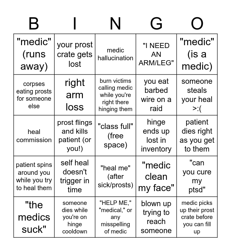This bingo card has a free space and 24 words: self heal doesn't trigger in time, someone dies while you're on hinge cooldown, burn victims calling medic while you're right there hinging them, "the medics suck", "medic" (is a medic), "medic" (runs away), corpses eating prosts for someone else, your prost crate gets lost, hinge ends up lost in inventory, "heal me" (after sick/prosts), you eat barbed wire on a raid, heal commission, "medic clean my face", "can you cure my ptsd", right arm loss, blown up trying to reach someone, patient dies right as you get to them, medic hallucination, someone steals your heal >:(, prost flings and kills patient (or you!), medic picks up their prost crate before you can fill up, patient spins around you while you try to heal them, "I NEED AN ARM/LEG" and "HELP ME," "medical," or any misspelling of medic.