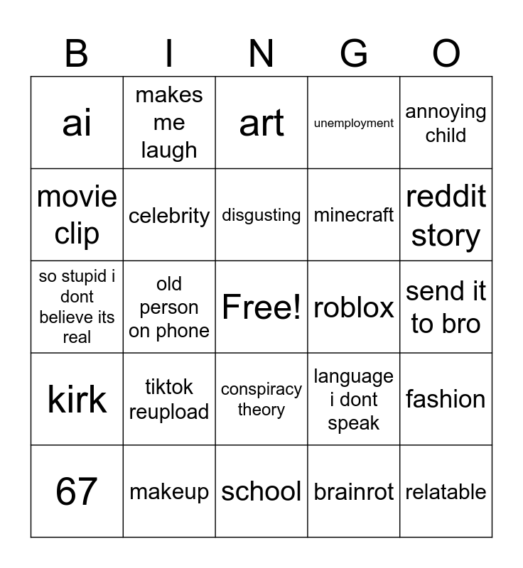 This bingo card has a free space and 24 words: tiktok reupload, makeup, disgusting, 67, annoying child, ai, movie clip, makes me laugh, roblox, conspiracy theory, minecraft, so stupid i dont believe its real, language i dont speak, fashion, celebrity, brainrot, send it to bro, art, reddit story, old person on phone, relatable, kirk, unemployment and school.