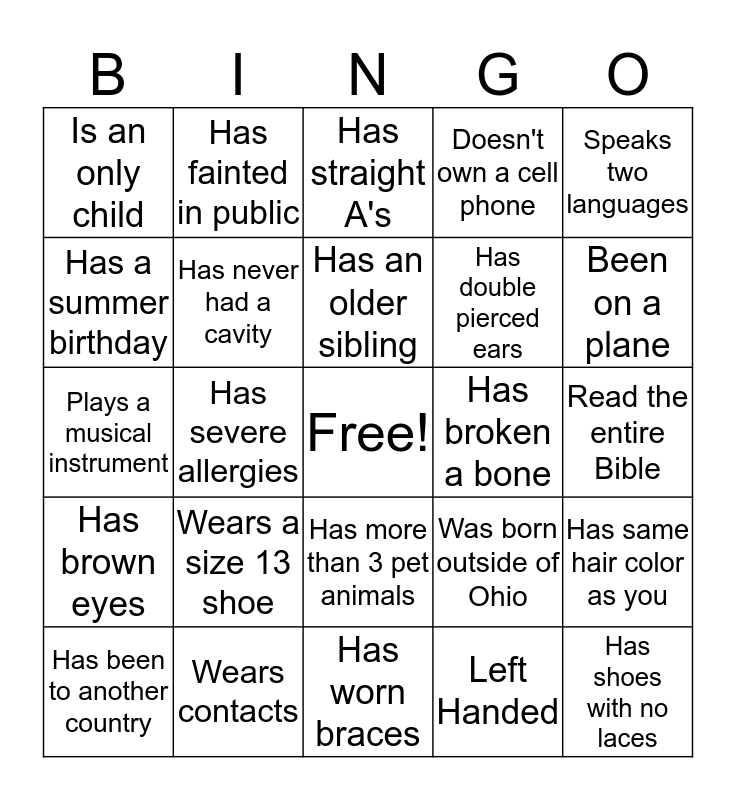 This bingo card has a free space and 24 words: Wears a size 13 shoe, Wears contacts, Has an older sibling, Has been to another country, Speaks two languages, Is an only child, Has a summer birthday, Has fainted in public, Has broken a bone, Has more than 3 pet animals, Has double pierced ears, Plays a musical instrument, Was born outside of Ohio, Has same hair color as you, Has never had a cavity, Left Handed, Read the entire Bible, Has straight A's, Been on a plane, Has severe allergies, Has shoes with no laces, Has brown eyes, Doesn't own a cell phone and Has worn braces.