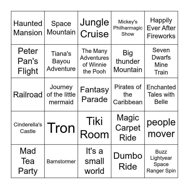 This bingo card has 25 words: Cinderella's Castle, Barnstormer, Fantasy Parade, Dumbo Ride, Happily Ever After Fireworks, Haunted Mansion, Space Mountain, Jungle Cruise, Pirates of the Caribbean, people mover, Peter Pan's Flight, Tiana's Bayou Adventure, It's a small world, Magic Carpet Ride, Seven Dwarfs Mine Train, Mad Tea Party, Journey of the little mermaid, The Many Adventures of Winnie the Pooh, Big thunder Mountain, Enchanted Tales with Belle, Railroad, Tron, Tiki Room, Mickey's Philharmagic Show and Buzz Lightyear Space Ranger Spin.