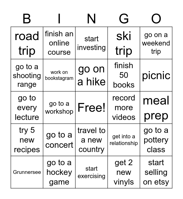 This bingo card has a free space and 24 words: go to a concert, go to a hockey game, go on a hike, Grunnersee, go on a weekend trip, road trip, go to a shooting range, finish an online course, record more videos, travel to a new country, finish 50 books, go to every lecture, get into a relationship, go to a pottery class, work on bookstagram, get 2 new vinyls, meal prep, start investing, picnic, go to a workshop, start selling on etsy, try 5 new recipes, ski trip and start exercising.