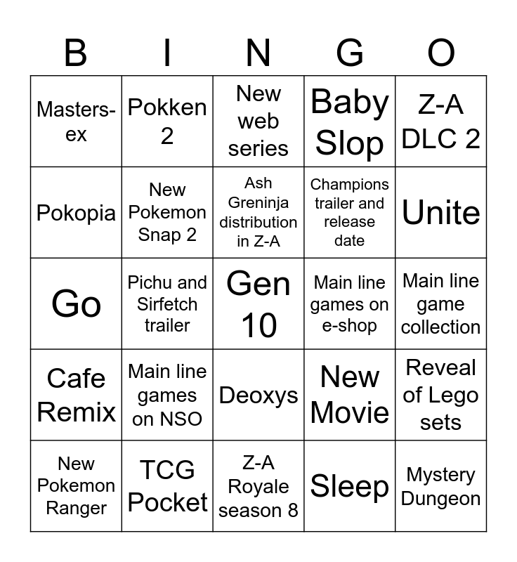 This bingo card has a free space and 24 words: Main line games on NSO, TCG Pocket, Ash Greninja distribution in Z-A, New Pokemon Ranger, Z-A DLC 2, Masters-ex, Pokopia, Pokken 2, Main line games on e-shop, Deoxys, Champions trailer and release date, Go, New Movie, Reveal of Lego sets, New Pokemon Snap 2, Sleep, Main line game collection, New web series, Unite, Pichu and Sirfetch trailer, Mystery Dungeon, Cafe Remix, Baby Slop and Z-A Royale season 8.