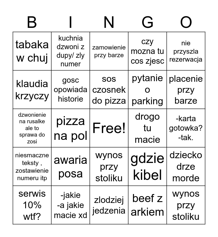This bingo card has a free space and 25 words: awaria posa, zlodziej jedzenia, sos czosnek do pizza, serwis 10% wtf?, nie przyszla rezerwacja, tabaka w chuj, klaudia krzyczy, kuchnia dzwoni z dupy/ zly numer, drogo tu macie, wynos przy stoliku, pytanie o parking, dzwonienie na rusalke ale to sprawa do zosi, gdzie kibel, dziecko drze morde, gosc opowiada historie, siadanie przy jedynym brudnym stoliku, -karta gotowka? -tak., zamowienie przy barze, placenie przy barze, pizza na pol, wynos przy stoliku, -jakie -a jakie macie xd, niesmaczne teksty , zostawienie numeru itp, czy mozna tu cos zjesc and beef z arkiem.