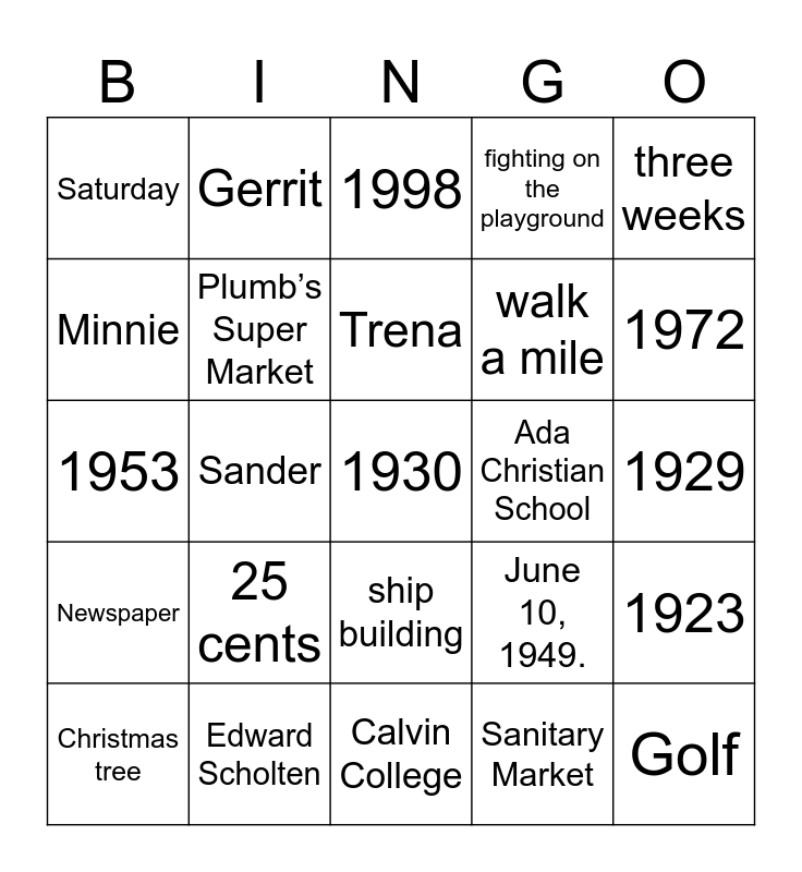 This bingo card has 66 words: Free!, Free, Free, 1923, Nov 13, 102, Gerrit, Bernie, Trena, Fannie, ship building, 2, 1929, three weeks, Henry, Minnie, Sander, Saturday, Potter’s house, walk a mile, 25 cents, Newspaper, fighting on the playground, junior high, $20-$30 a week, beef roast and potatoes, 22 cents, 12 cents, 1930, an ice cream cone, Christmas tree, 12 years old, clown, 17 years old, June 10, 1949., Edward Scholten, Ryskamp Whole Sale meats, 1953, Sanitary Market, Steaks, Plumb’s Super Market, Ada Christian Reformed Church, Ada Christian School, late 1960’s, Koning Car Company, Beimers Car Sales, 1972, Cascade Cars, Golf, a joke, August 1, 1925, Kendale Furniture factory, stomach ulcer, 80, Potatoes, three, 2 mile walk, 1998, Calvin College, Arlene,MI, Mercy Hospital, pediatrics department, Metro Hospital, Porter Hills retirement Village and baby sweaters.